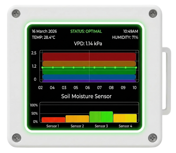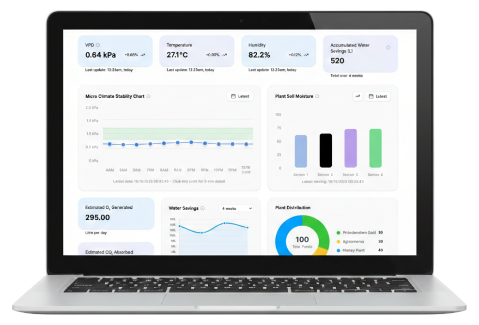 Sensors placed alongside your office plants measure what they contribute: humidity, temperature, and Vapor Pressure Deficit (VPD) every 5 minutes.